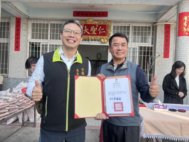 本區蔡佳甫區長及藍天寶主秘分別前往致贈感謝狀,感謝各界善心團體長期辦理展愛送暖活動,造福弱勢戶,盼社會各界持續提供資源挹注弱勢,擴大公益支持能量。