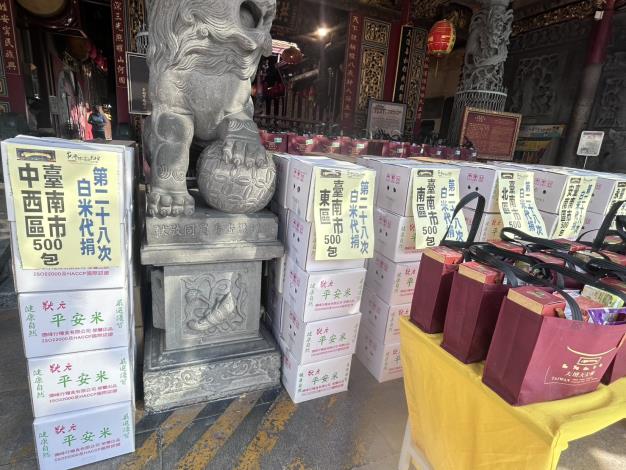 臺灣首廟天壇於9月30日(星期二)下午3時捐助中西區、北區、南區、東區、安平區、安南區、永康區及家扶中心等8單位平安米及普渡禮盒,本區計受贈500包平安米及普渡禮盒。