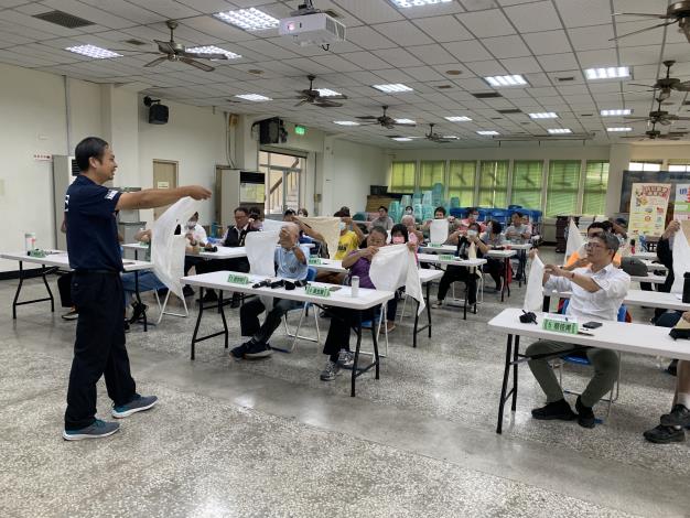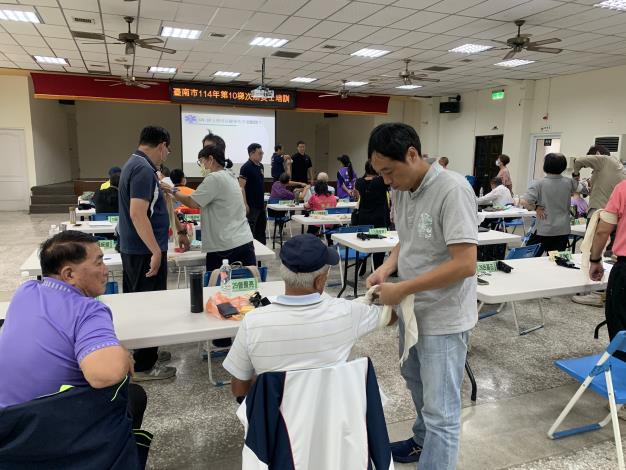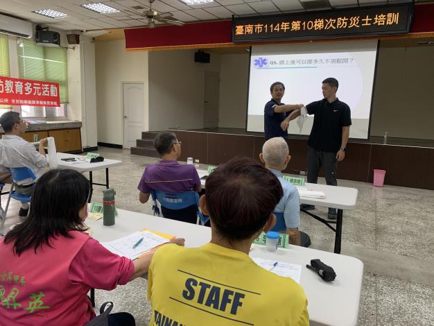 第二天課程著重個人及居家防護措施,包括準備緊急避難包、居家安全檢查、災害期間生活應對及緊急通訊方式等,最後安排基礎急救訓練,學員們實際操作CPR與AED使用及各類包紮技巧,確保在緊急時刻能正確且快速地提供救援。