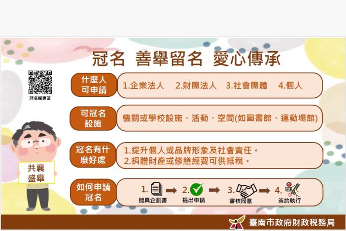 依「臺南市政府所屬各機關學校辦理冠名作業要點」規定,民間得向本府所屬各機關學校以捐贈財產或自負經費興建、修繕之市有財產申請辦理冠名權利。