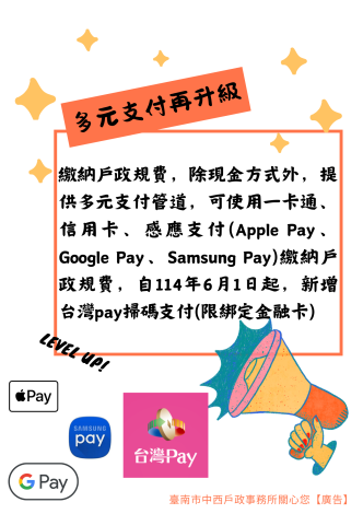 為提供民眾更多元快速繳納戶政規費方式,本所新增台灣Pay(限綁定金融卡/帳戶)可掃描支付戶政規費,歡迎多加利用。