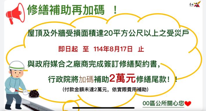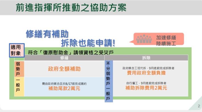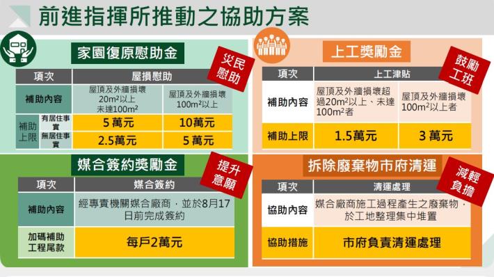 前進指揮所副指揮官李孟諺表示,除了民眾大多數都有申請的家園復原慰助金之外,目前在8月17日以前透過區公所完成與民宅修繕廠商完成媒合簽約,加碼補助工程尾款每戶2萬元,行政院更補助上工獎勵金(屋頂及外牆損壞超過20平方公尺以上,未達100平方公尺者補助1.5萬元;損壞面積超過100平方公尺以上者補助3萬元),鼓勵工班投入災區修繕民房的行列,並由行政院公共工程委員會提供工程合約範本,多管齊下的政策讓民眾能以合宜的價格媒合廠商來修繕住宅。