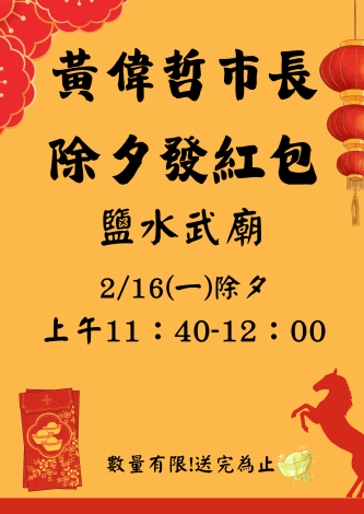 黃偉哲市長將於除夕當天蒞臨 🙏 鹽水武廟 發送新春紅包,祝福大家新的一年 🐴 金馬伍吉、福氣滿滿 ~📍 地點|鹽水武廟🕚 時間|2/16(除夕) 上午 11:40 – 12:00🎁 數量有限,送完為止✨ 想拿新年第一份好彩頭的朋友,記得提早到場,一起在武廟迎接金馬伍吉的好兆頭!