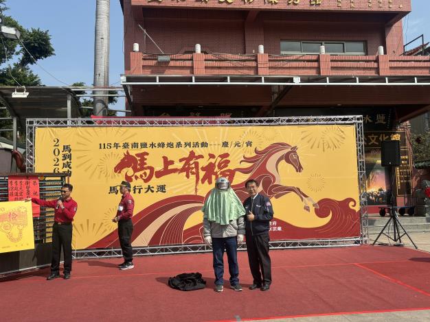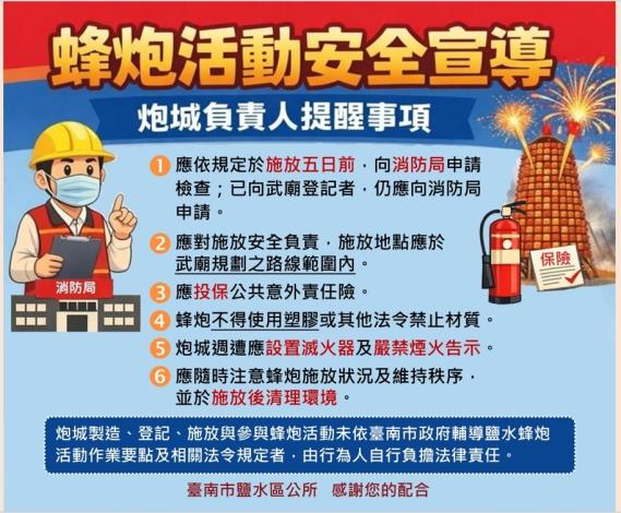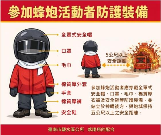 記者會也特別邀請消防局展示今年炮城合格黃色標籤並由專業人員現場示範參加蜂炮活動的「完整防護穿著」。整體服裝應以「非可燃性材質」為佳,包括可穿戴全罩式安全帽(保護頭部)、棉質毛巾(保護頸部)、口罩(保護呼吸道)、棉質或牛仔厚外套、棉質或牛仔厚長褲、棉質手套、棉質襪子、平底鞋或運動鞋等等,參加者做好安全防護,並與炮城保持五公尺以上之安全距離,安全快樂犁蜂炮。