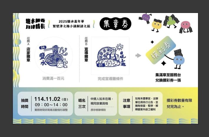 另有集章任務!⚡集滿2個章可於鹽水嘉年華活動當天至服務台兌換摸彩券