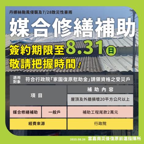 受丹娜絲颱風影響房屋屋頂及外牆受損達20平方公尺(需符合行政院「家園復原慰助金」請領資格之受災戶)的民眾注意,行政院媒合修繕補助簽約期限 至8月31日止。