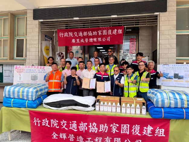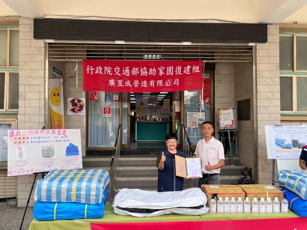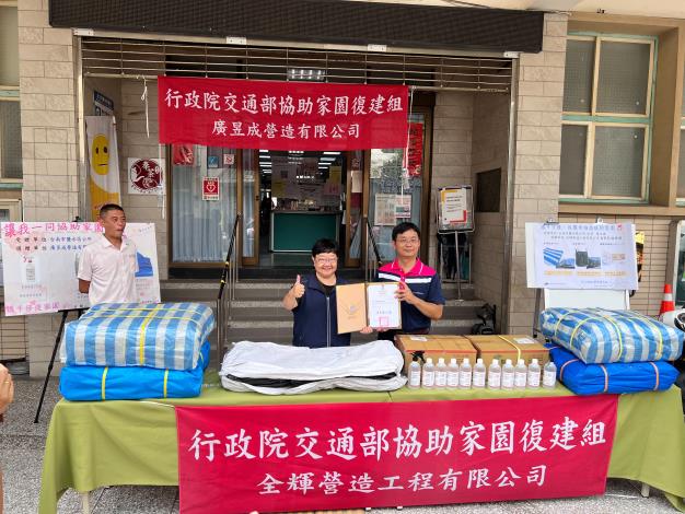區長陳文琪表示,感謝廣昱成營造有限公司、全輝營造工程有限公司在災後捐贈災後復原所需物資,不僅協助修繕受損房屋,也展現企業善盡社會責任的具體行動,與政府共同守護居民的健康與安全,此次物資將提供本區受災民眾領取,盼能更加速災後環境復原作業,早日讓居民回復正常生活。