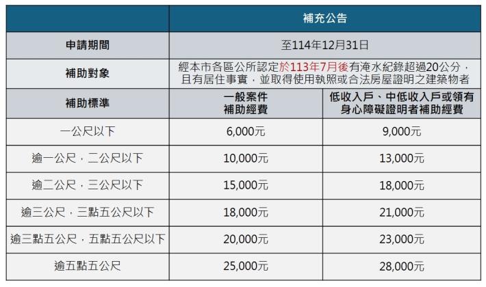 二、補助條件:113年7月後有淹水紀錄超過20公分且有居住事實並取得使用執照或合法房屋證明之建築物者