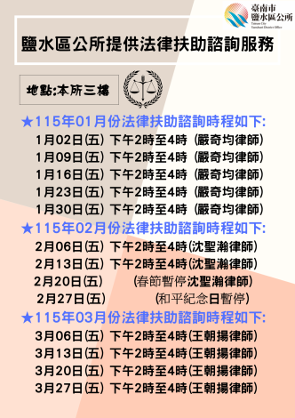 3.法律諮詢時間:當月每週五下午2時至4時