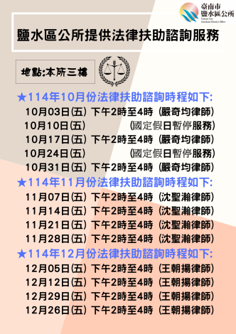 2.施行日期:自114年1月1日起至114年12月31日止;地點:本所3樓法律扶助諮詢室。