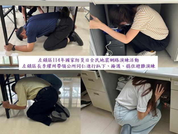 於114年9月19日上午9點21分,由中央氣象署透過「災防告警細胞廣播訊息系統」發布「國家防災日地震警報」訊息,左鎮區區長李燿州帶領公所同仁進行地震避難3步驟(趴下 Drop、掩護 Cover、穩住 Hold on)演練。